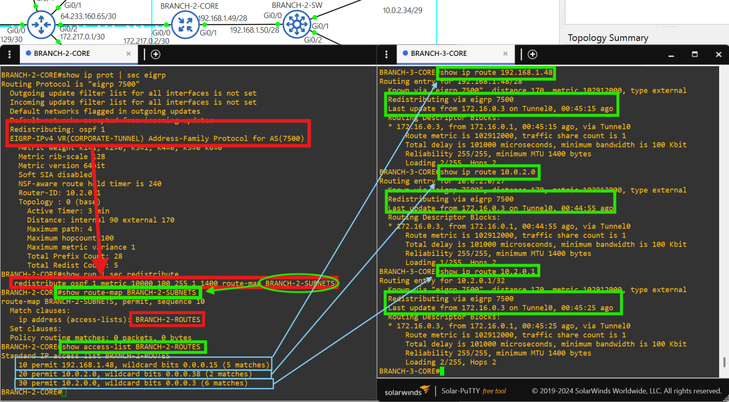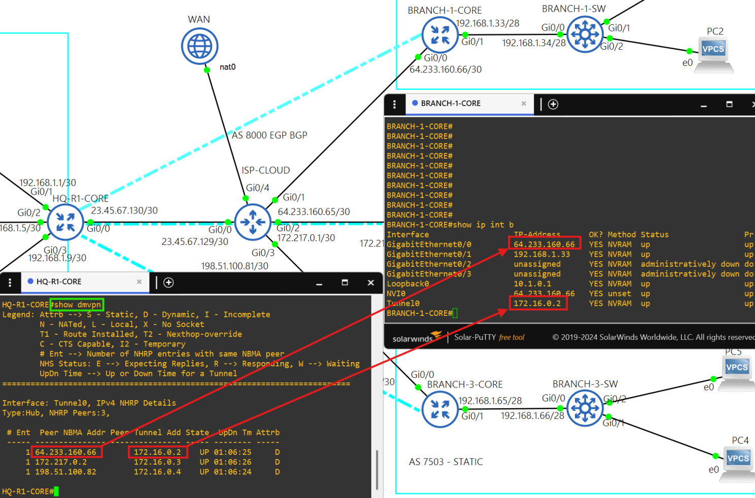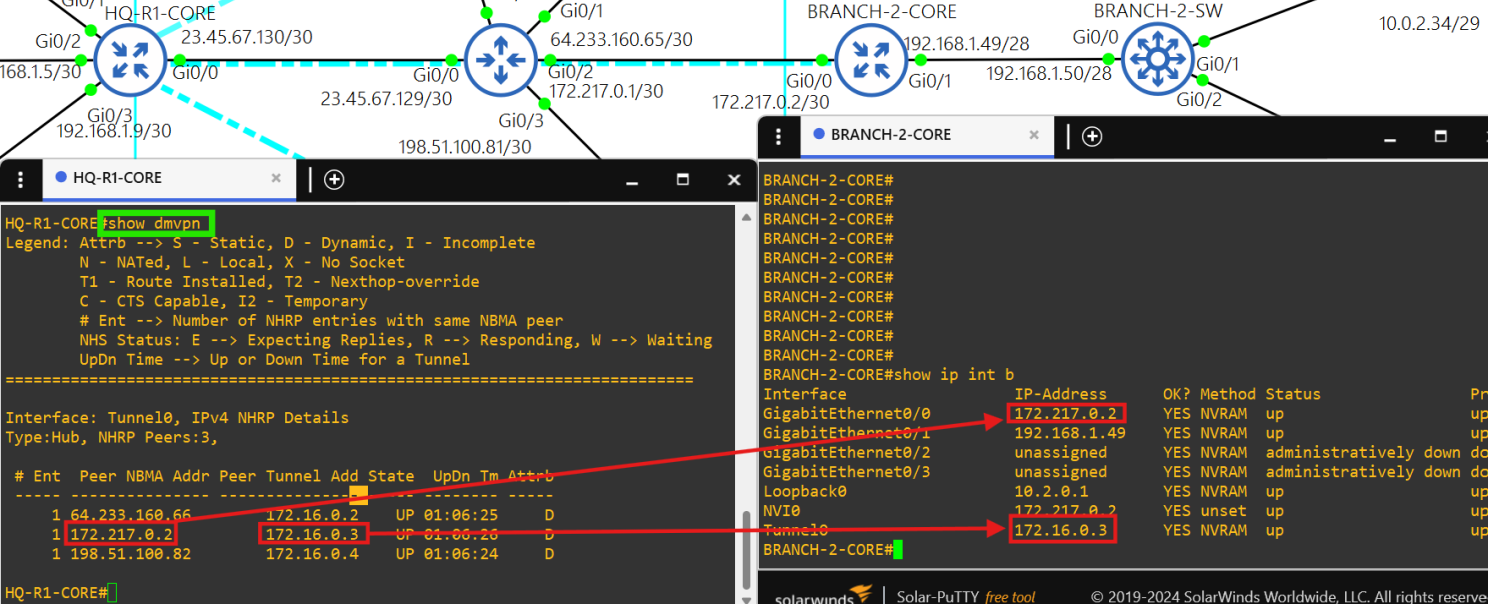 Core router BRANCH-2-CORE is a spoke(172.16.0.3/28) in the DMVPN tunnel.
