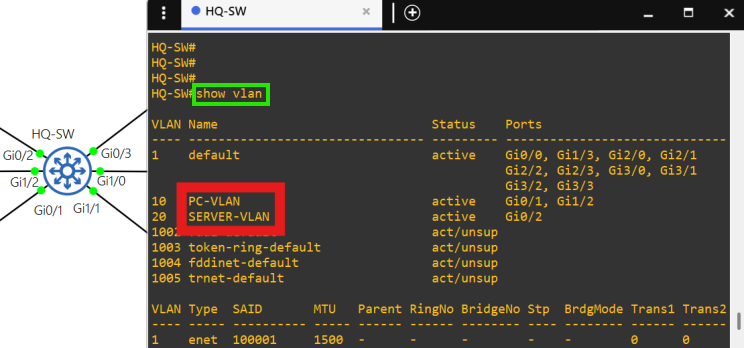 There are only 2 VLANs at each site, the PC VLAN and the SERVER VLAN.