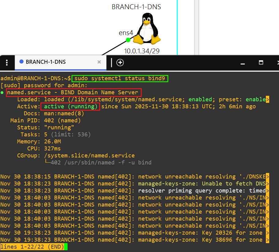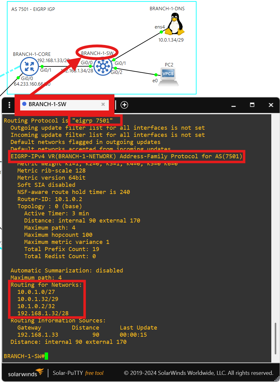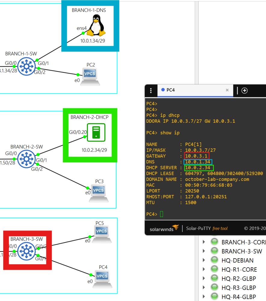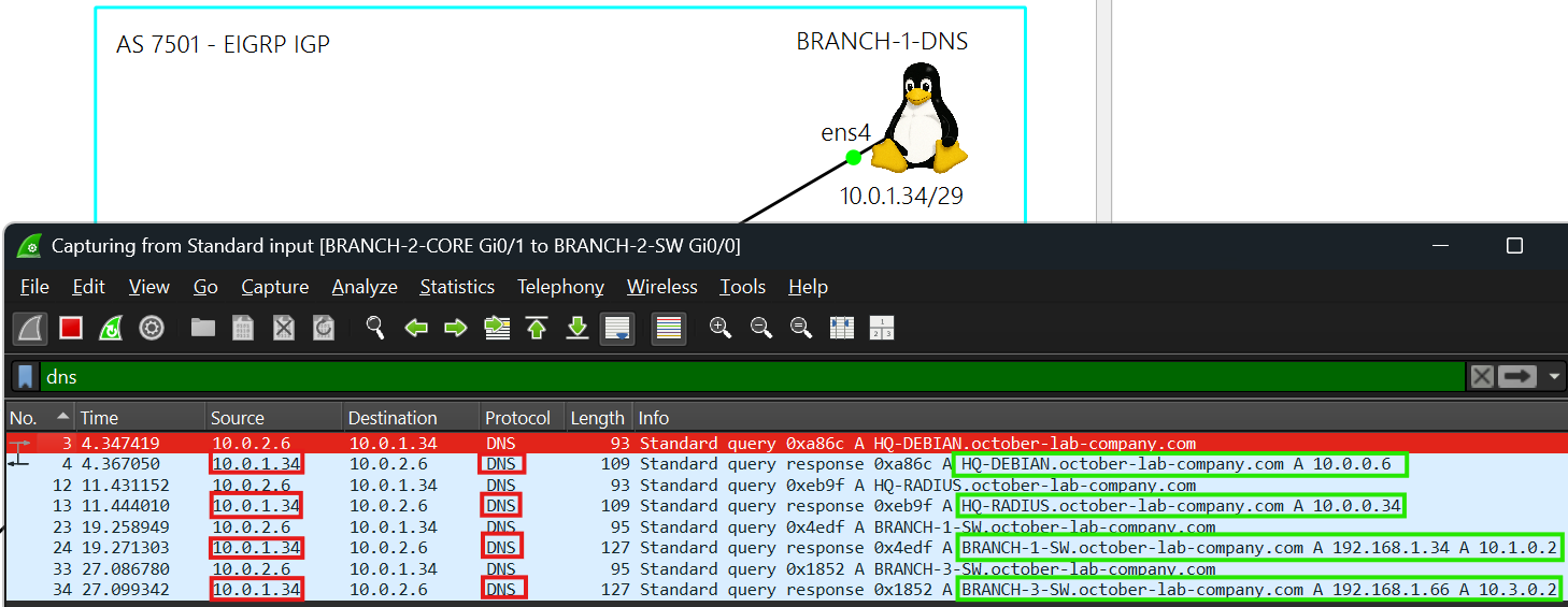 10.0.1.34 is the DNS server. BRANCH-1-DNS also uses public DNS servers 1.1.1.1 and 8.8.8.8.