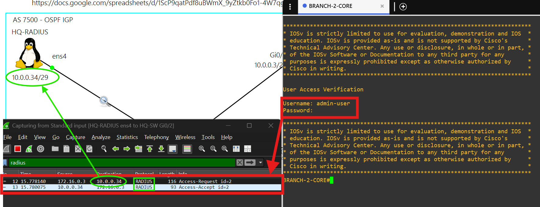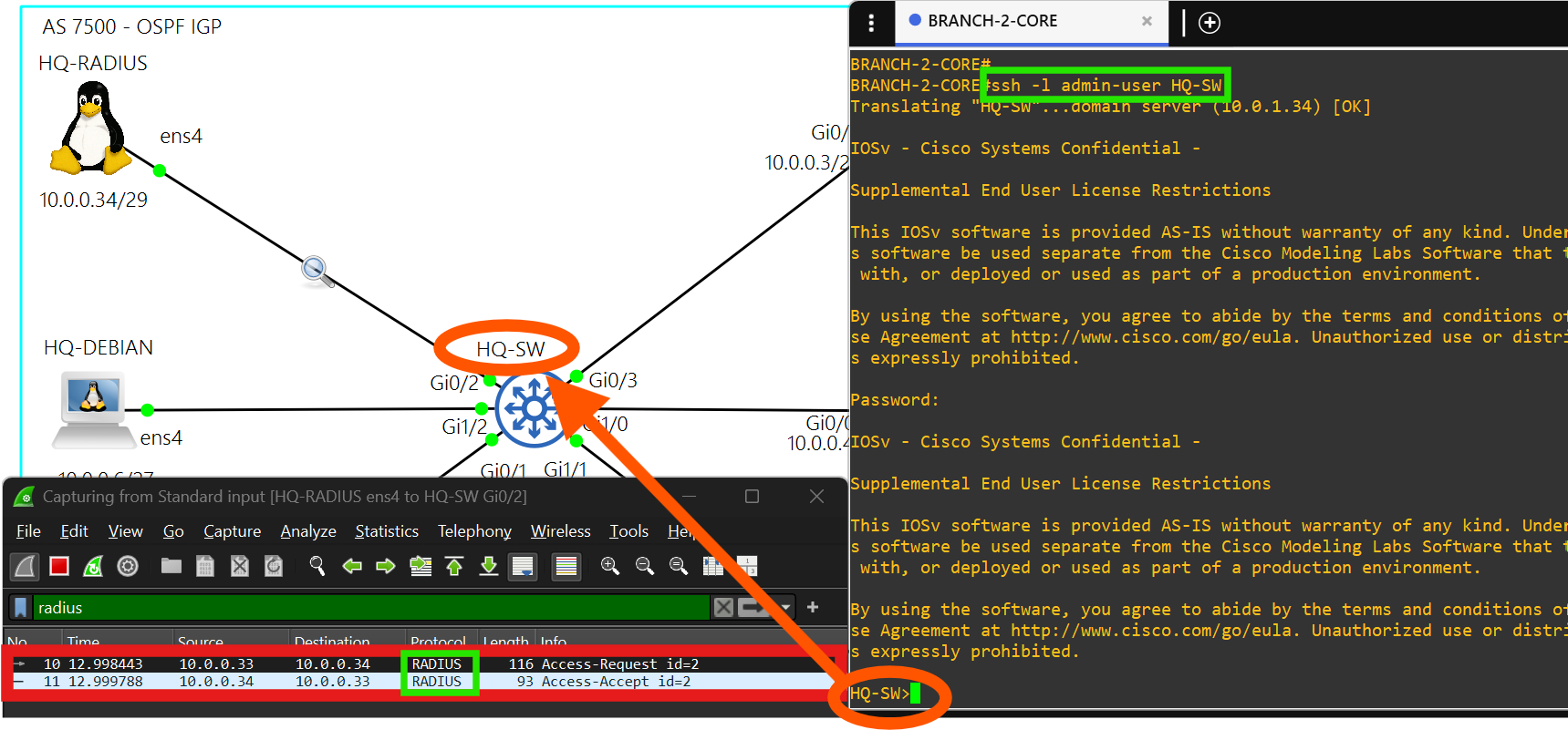 You must sign into each network device at a site using credentials stored on the RADIUS server, HQ-RADIUS, in AS 7500.