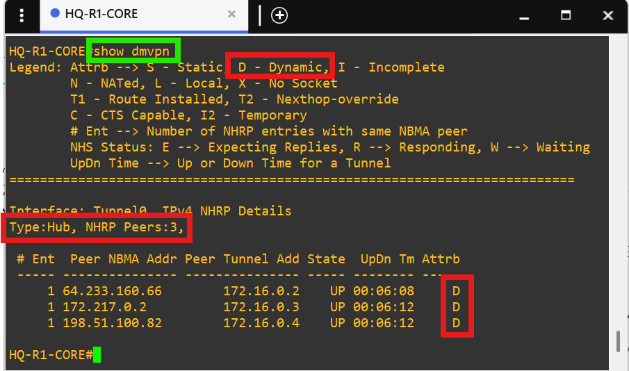 Core router HQ-R1-CORE is the hub in the DMVPN tunnel(172.16.0.1/28) between each site.