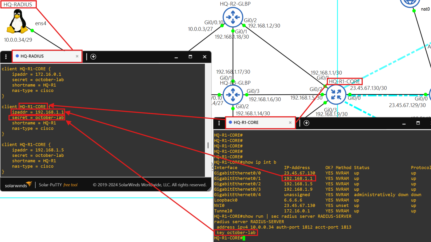 Each client is able to authenticate using the key october-lab over ports 1812 and 1813.