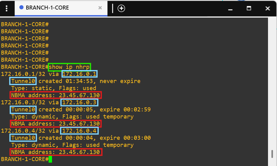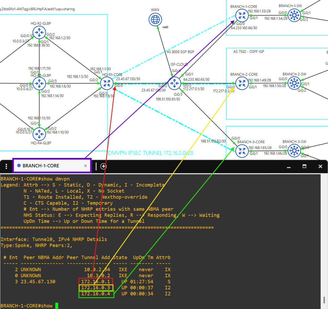 Core router BRANCH-1-CORE is a spoke(172.16.0.2/28) in the DMVPN tunnel.