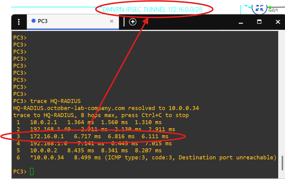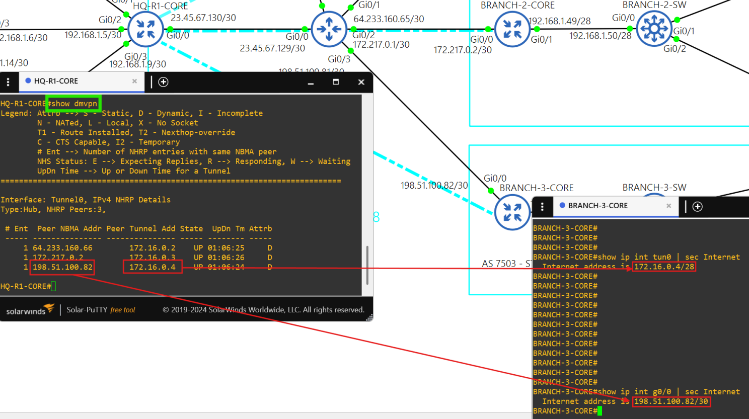 Core router BRANCH-3-CORE is a spoke(172.16.0.4/28) in the DMVPN tunnel.