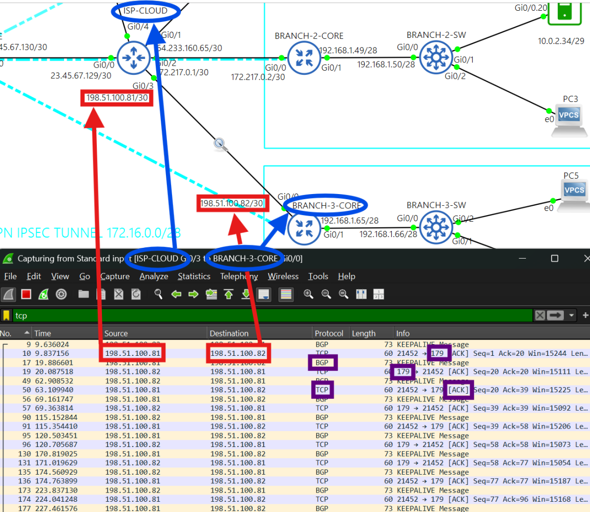 Active BGP connection between ISP-CLOUD and BRANCH-3-CORE routers. The ISP-CLOUD router filters private addresses.