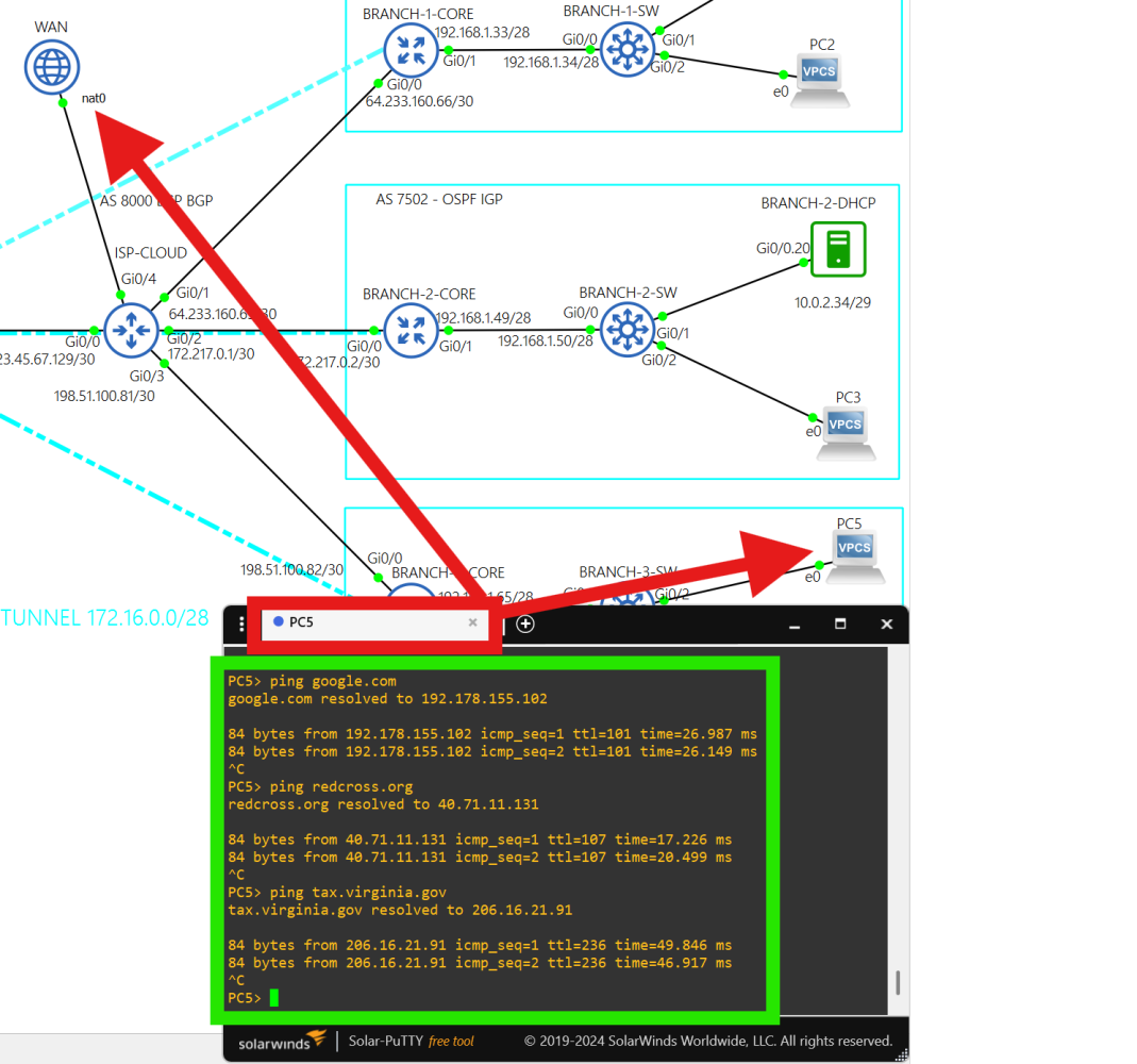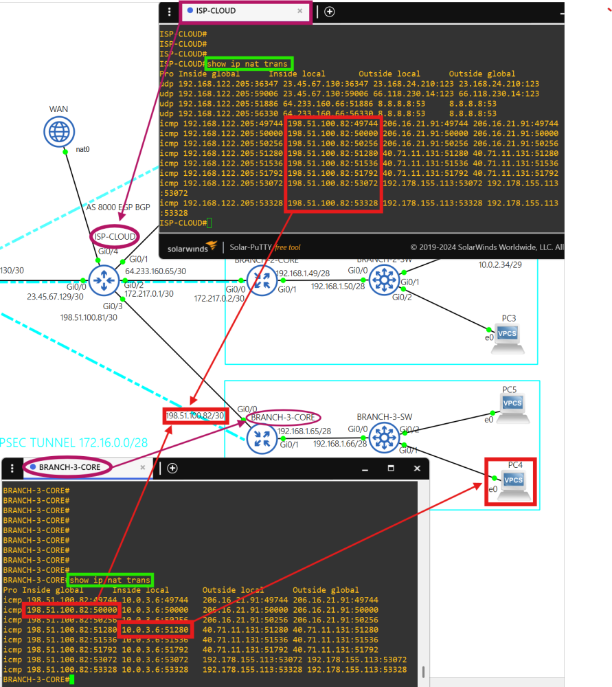 Traffic from each site going to the public internet is translated with NAT at the core routers, and then translated again at interface g0/4 on the ISP-CLOUD router.